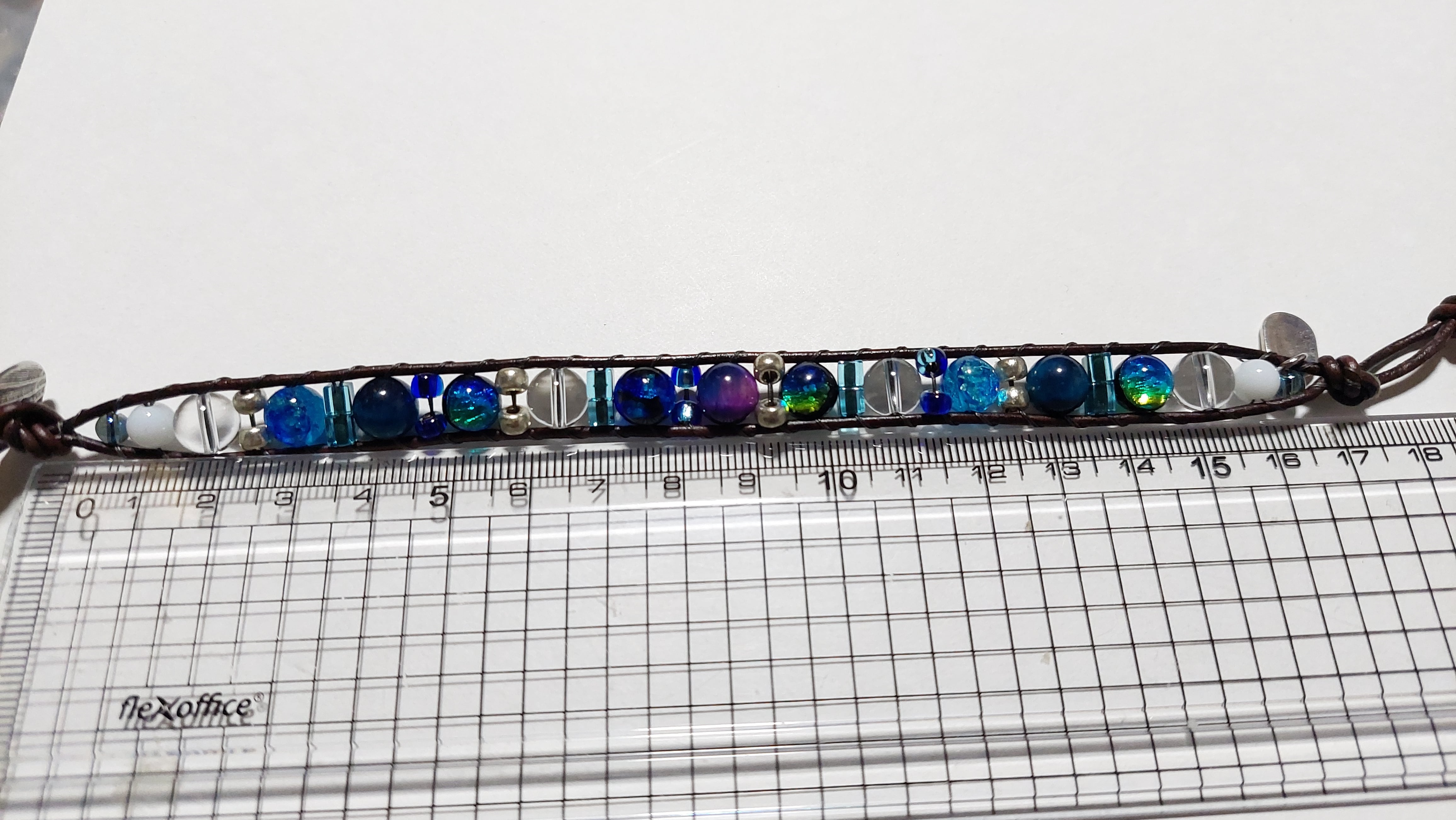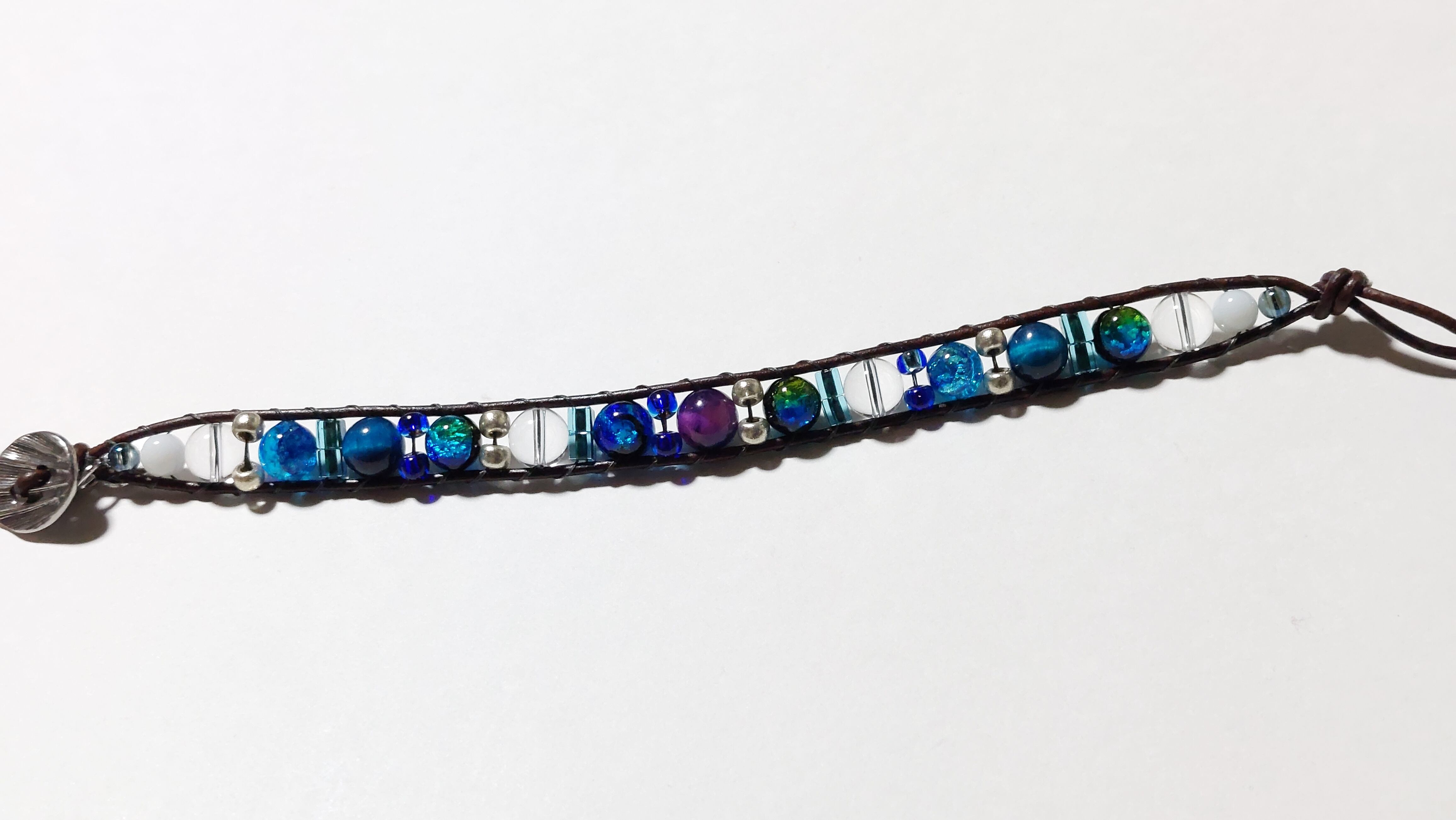 ホタルガラス、天然石、本革を使用したラップブレスレットです