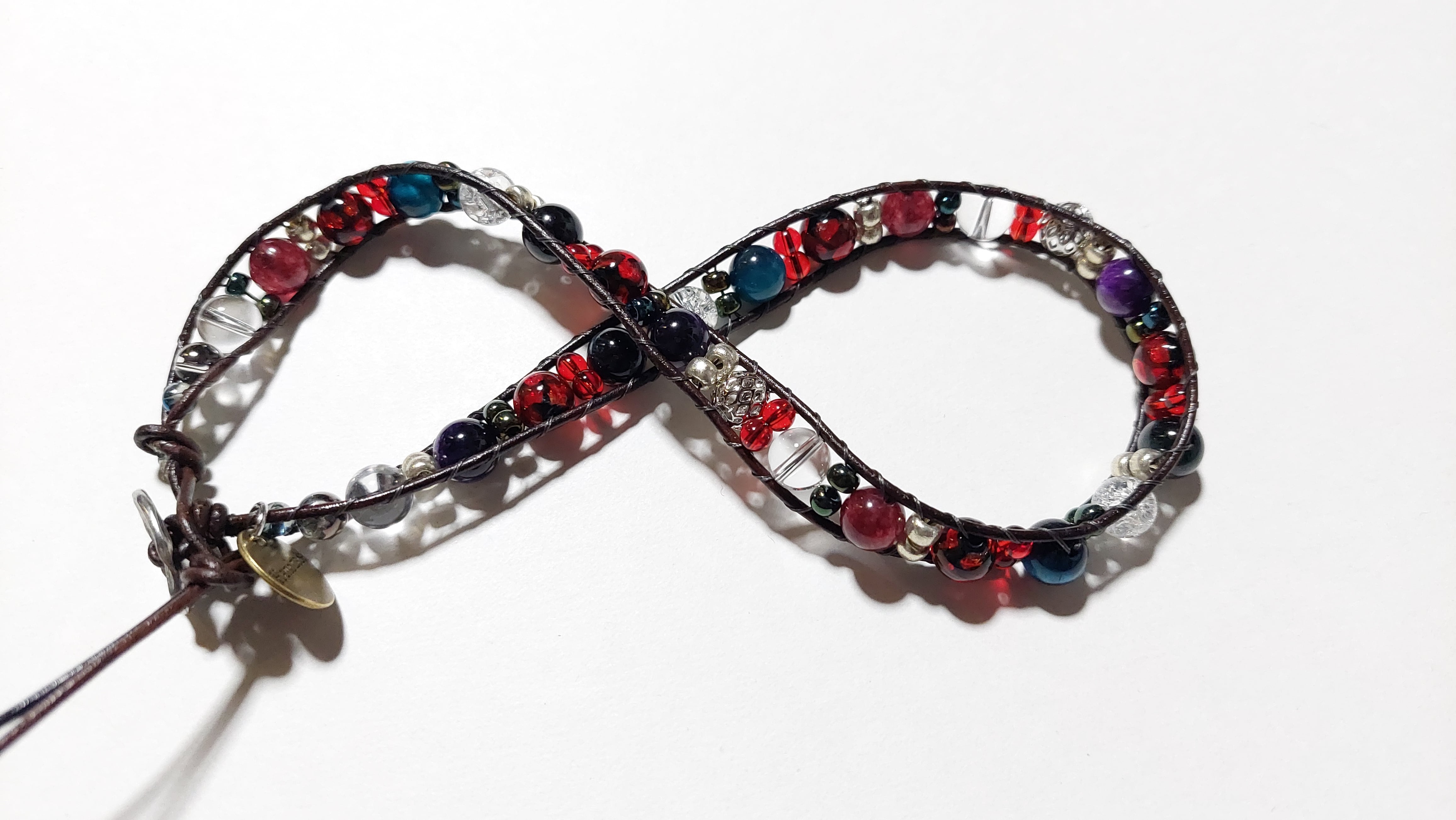 ホタルガラス、天然石、本革を使用したラップブレスレットです