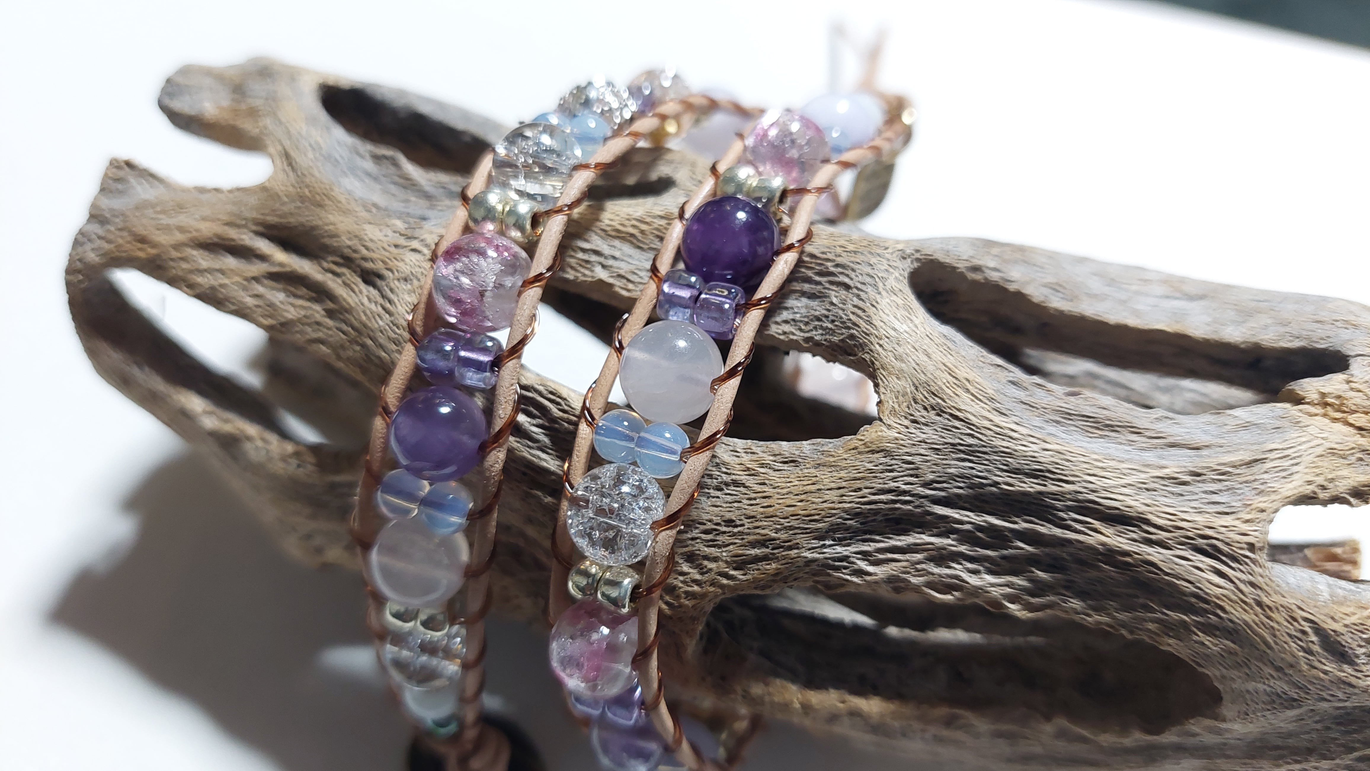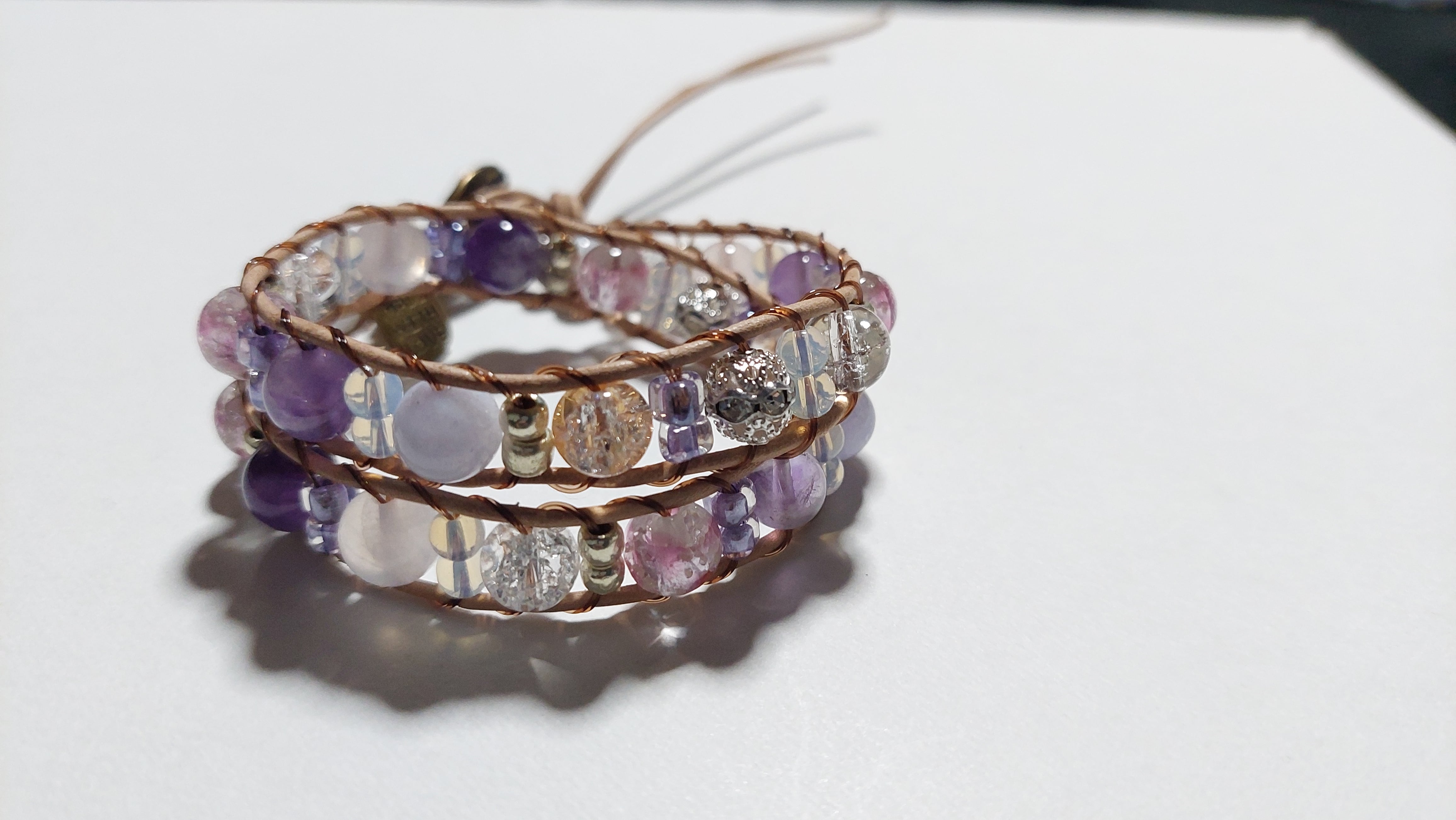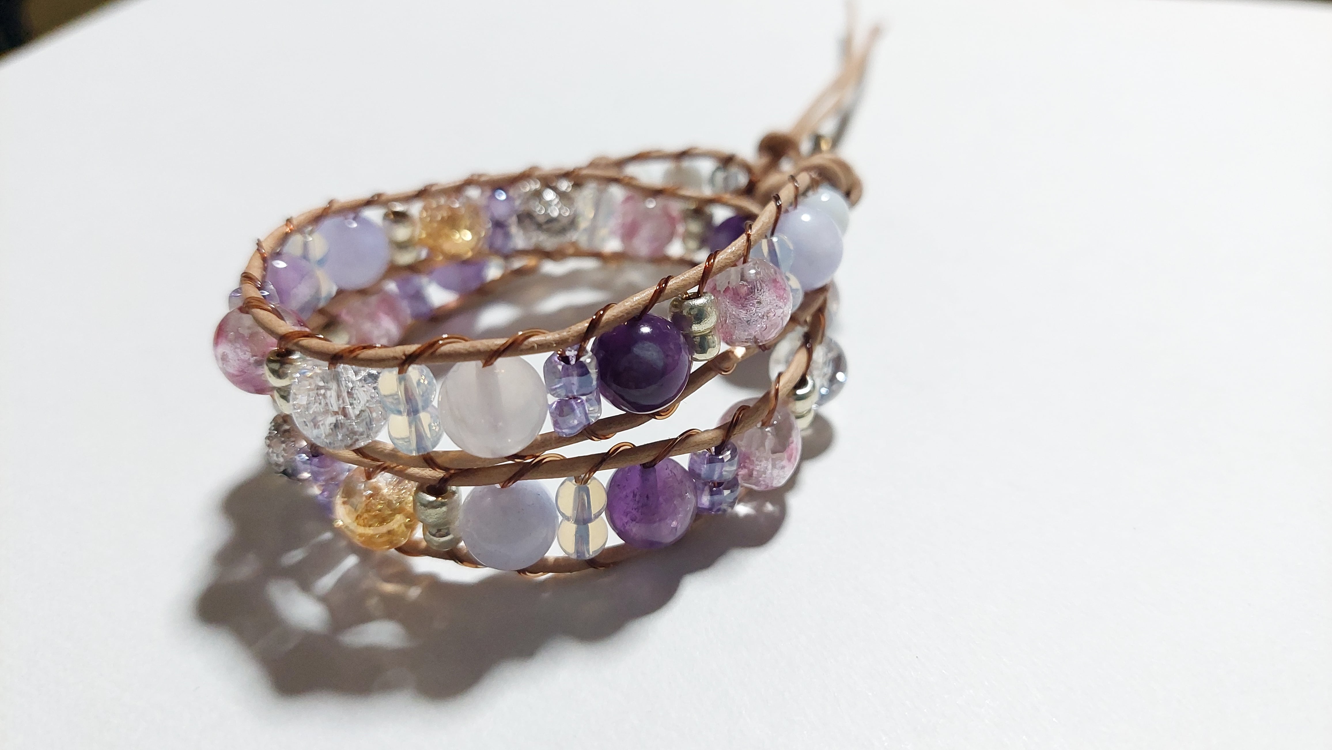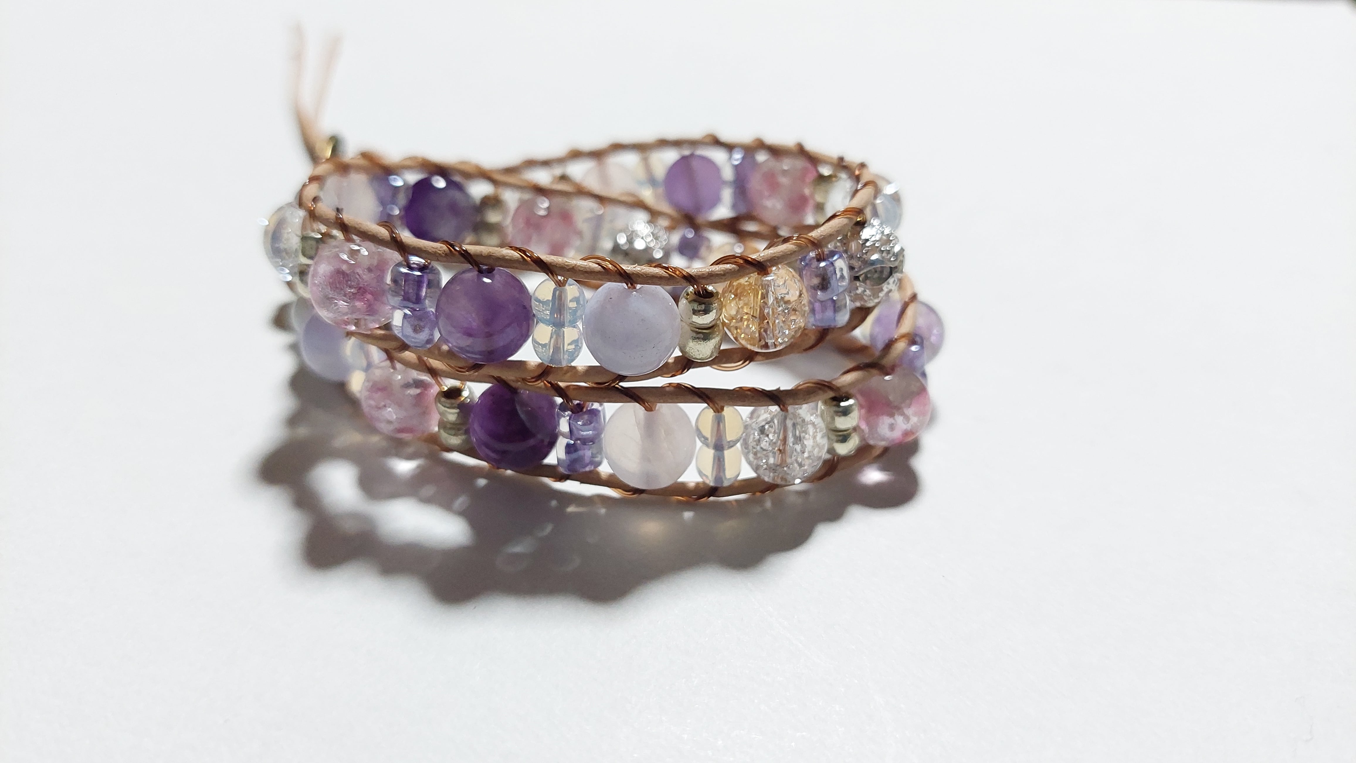 ホタルガラス、天然石、本革を使用したラップブレスレットです